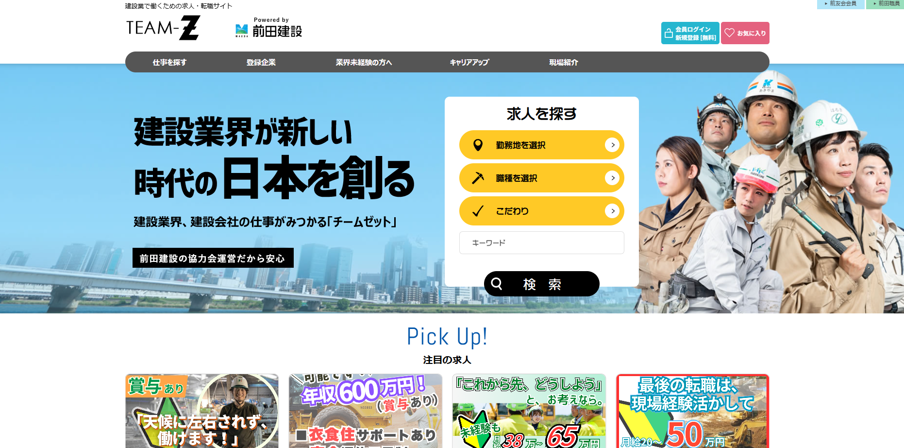 TEAM-Zは建設業に特化した求人サイトであり、土木・建築・電気・設備工事まで多岐にわたる職種を網羅しています。